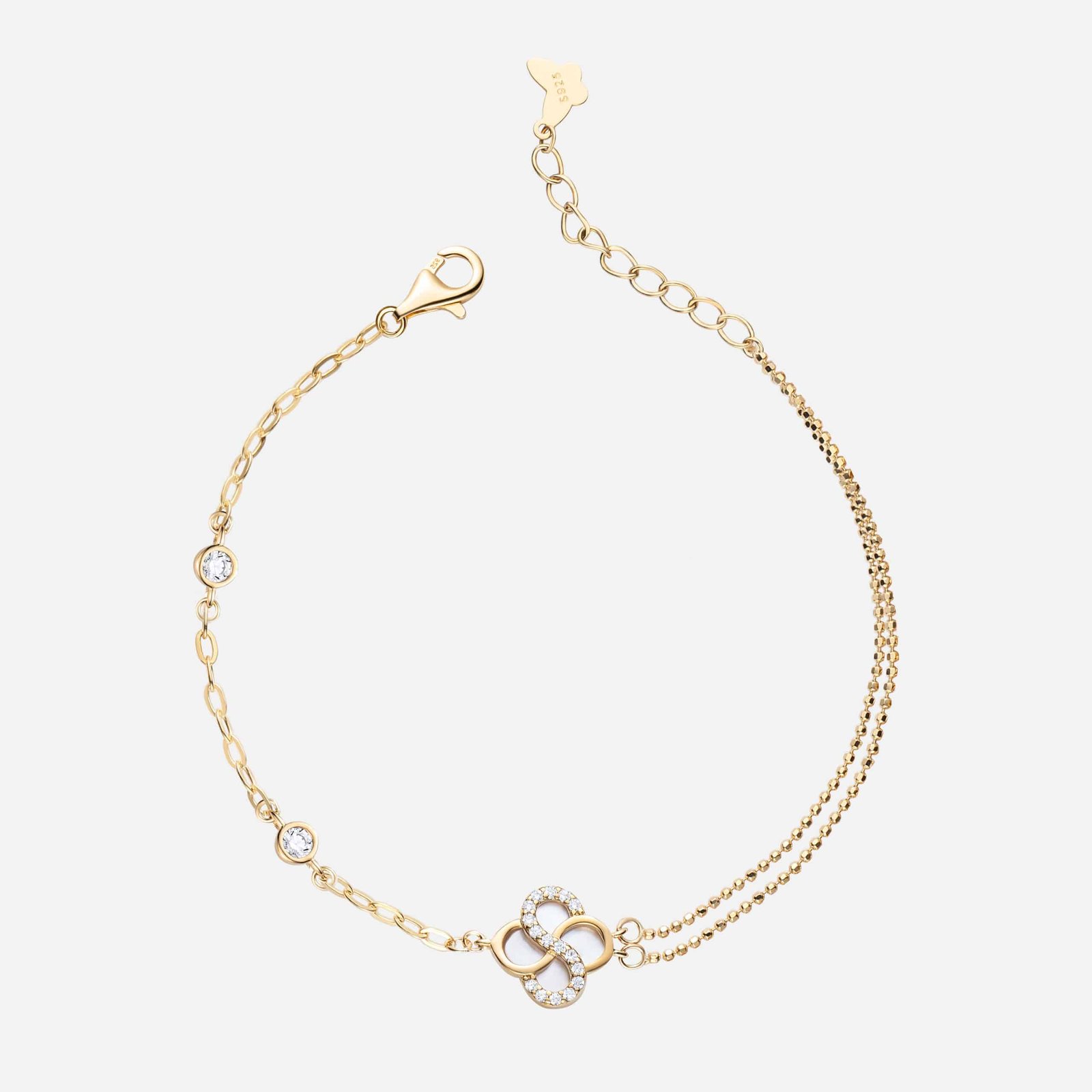 Radiant and refined, Celestelle is a delicate gold bracelet crafted with a graceful double chain – one classic link, the other a fine beaded strand. At its centre lies a glittering quatrefoil-inspired floral motif, encrusted with tiny gemstones that catch the light with every movement. Two larger solitaire stones accent the chain for a subtle touch of brilliance. A balanced blend of elegance and luminosity, perfect for everyday sparkle or special moments.