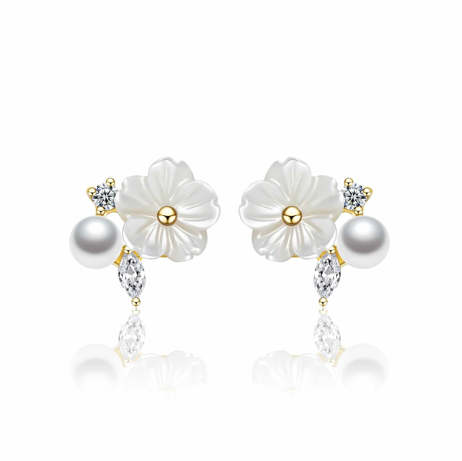 Delicately crafted, Eira is a pair of flower-shaped stud earrings that capture quiet elegance. Made from luminous white mother-of-pearl with a warm gold centre, each bloom is accented by a petite pearl and sparkling stones set in gold. Soft, feminine, and full of light, Eira is a timeless ode to natural beauty – graceful enough for everyday, radiant enough for something special.