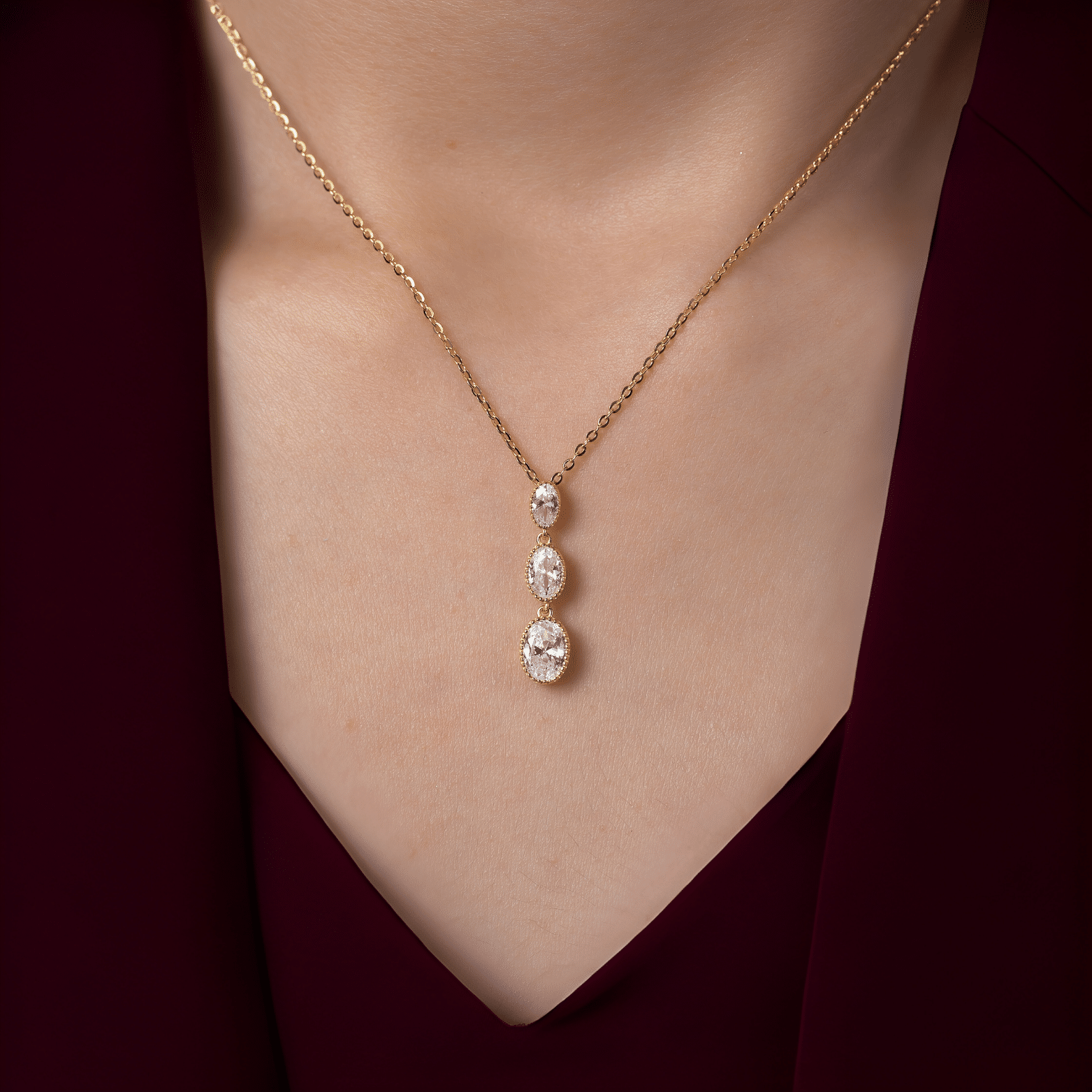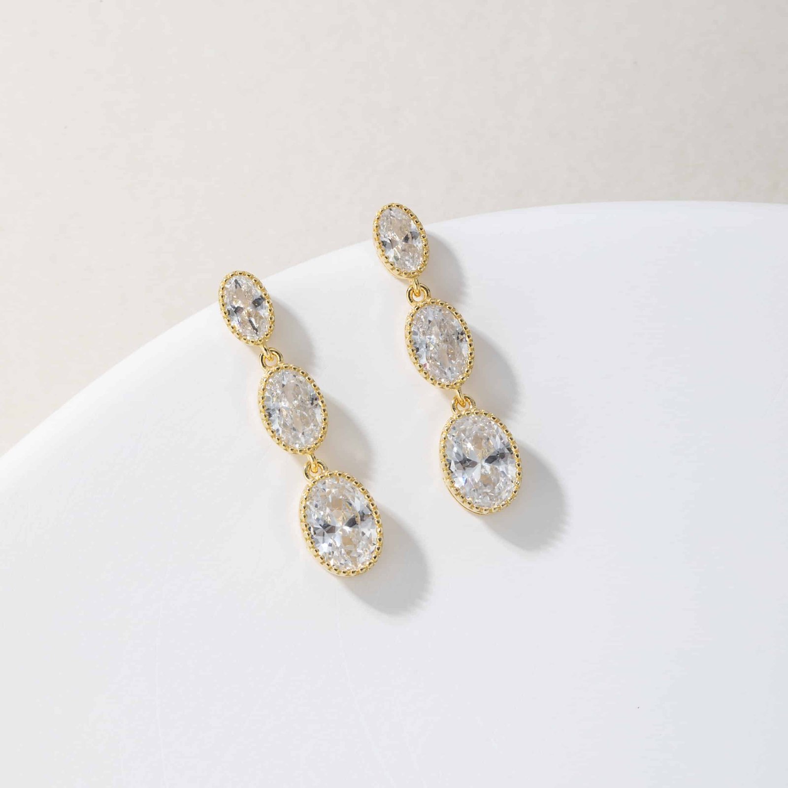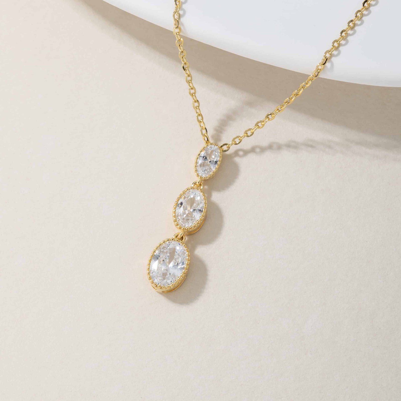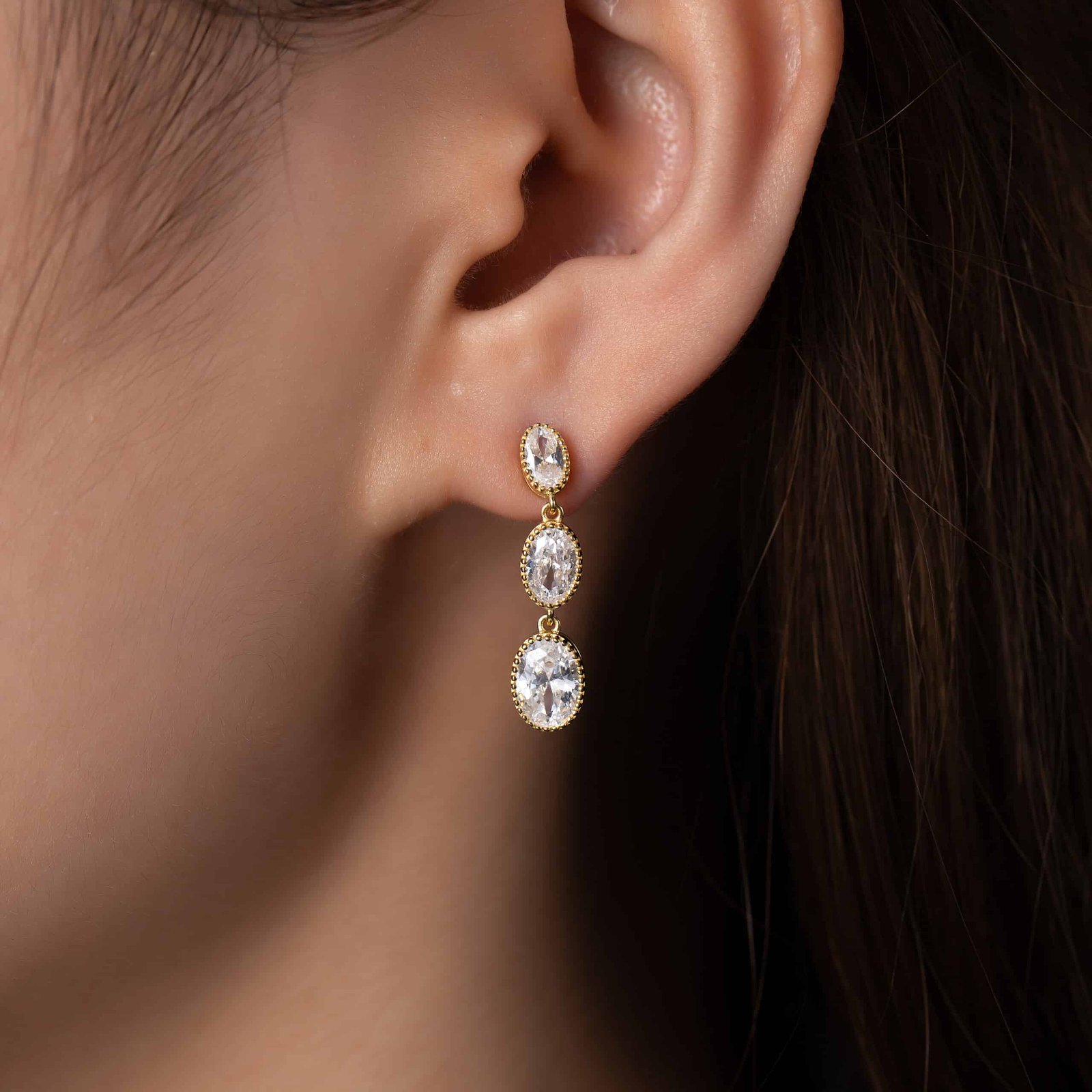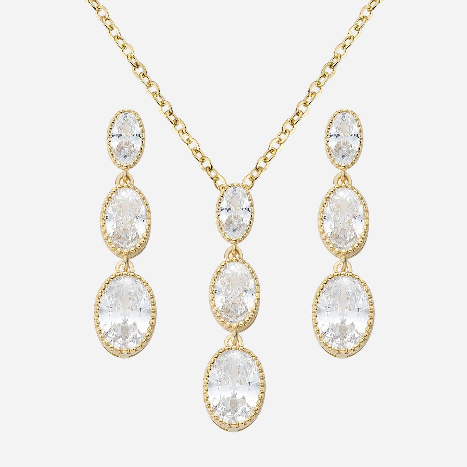 Radiance in every drop. The Gleam Trio Set features a cascading trio of oval-cut stones, each framed in a delicate beaded setting that amplifies their brilliance. Designed to elongate and illuminate, the earrings and pendant move with grace, catching light from every angle. Available in both gold and silver finishes, this set is a versatile statement — timeless, dazzling, and effortlessly elegant.