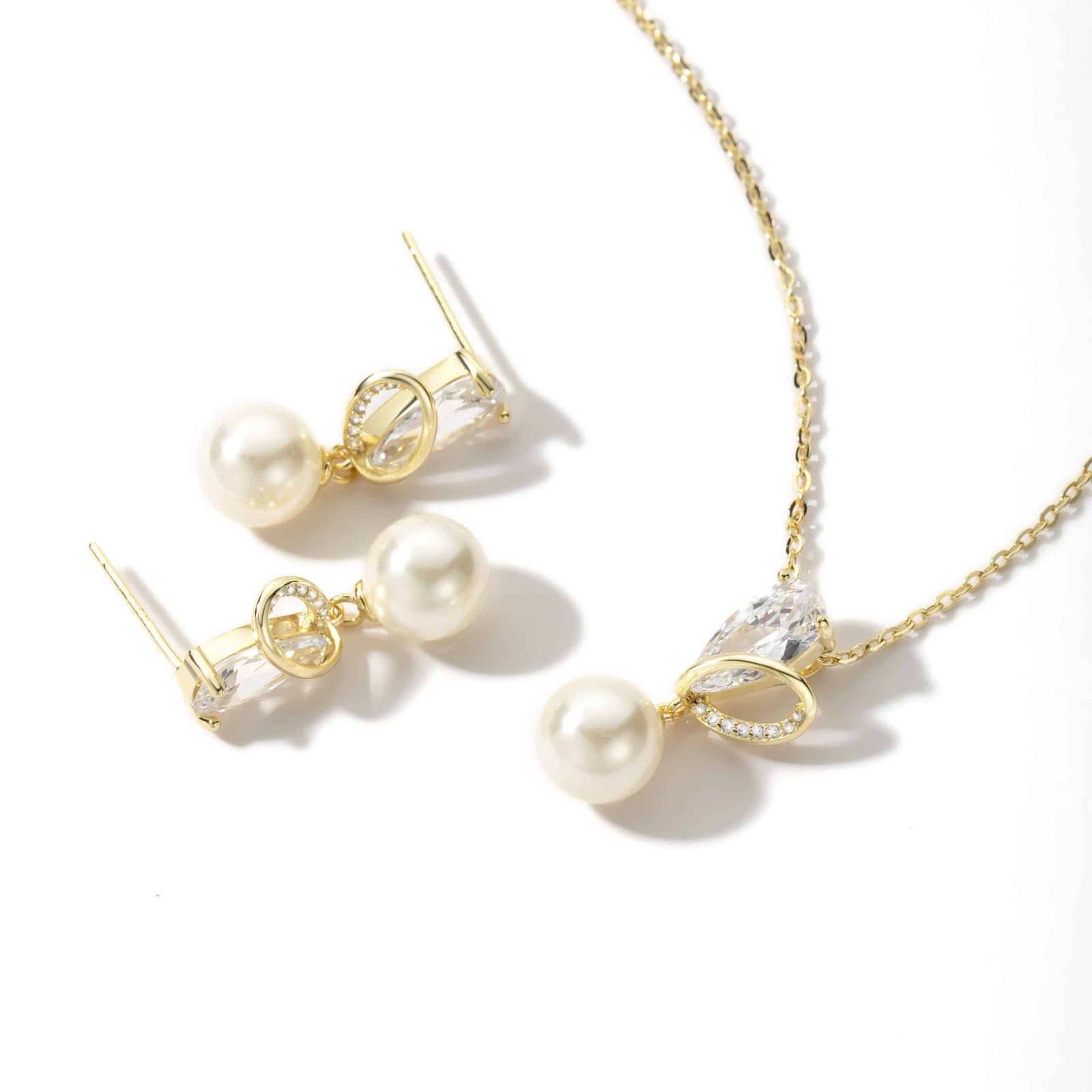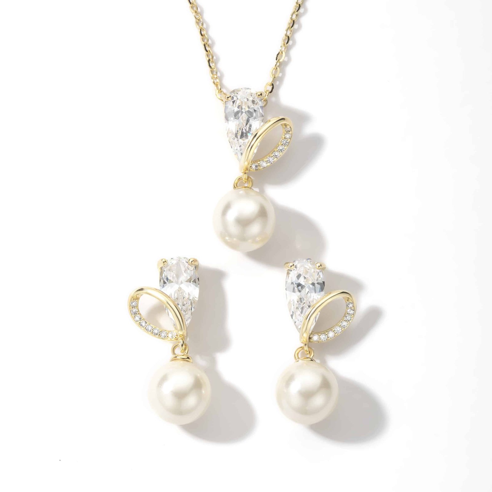 Elegant and refined, Golden Teardrop is a matching jewellery set featuring a necklace and earrings, each centred around a radiant teardrop-shaped cubic zirconia. A graceful gold curve, encrusted with delicate stones, wraps gently around the crystal, leading to a lustrous cream-toned pearl that softly sways below. A timeless design that pairs sparkle with softness, Golden Teardrop adds a touch of quiet luxury to any look.