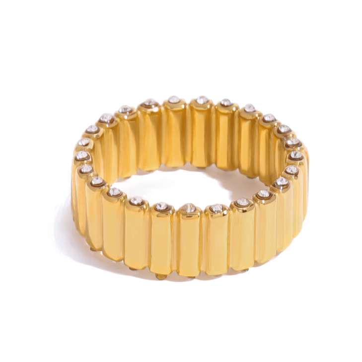 Bold yet graceful, Hala is a gold-toned ring designed to shine. Featuring a structured band of vertically aligned rectangular bars, each topped with a delicate, sparkling stone, the ring creates a rhythmic glow that catches the light from every angle. Its polished finish and architectural silhouette make Hala a modern statement – radiant, refined, and endlessly versatile.