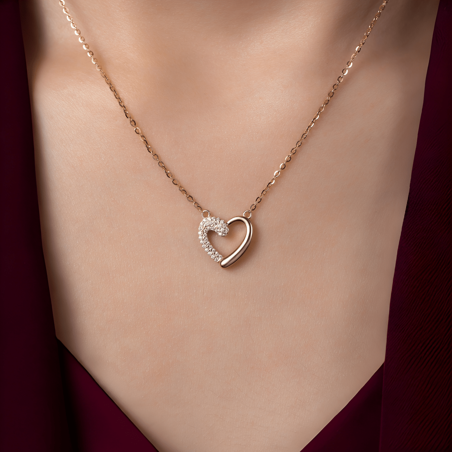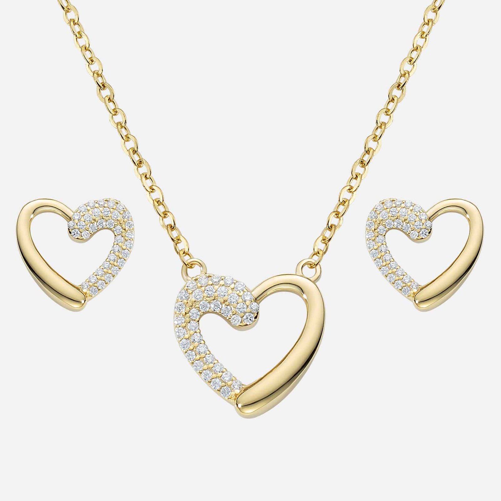 Heartlight is a delicate jewellery set featuring a necklace and matching earrings, each shaped in a classic heart silhouette. The outline of each heart is adorned with a pavé -style setting of small, clear stones, adding a soft, romantic sparkle. Suspended from a fine chain, the necklace brings a graceful glow to any look. Available in both gold and silver finishes, Heartlight is timeless and meaningful – a radiant symbol of love, made to shine in your choice of tone.