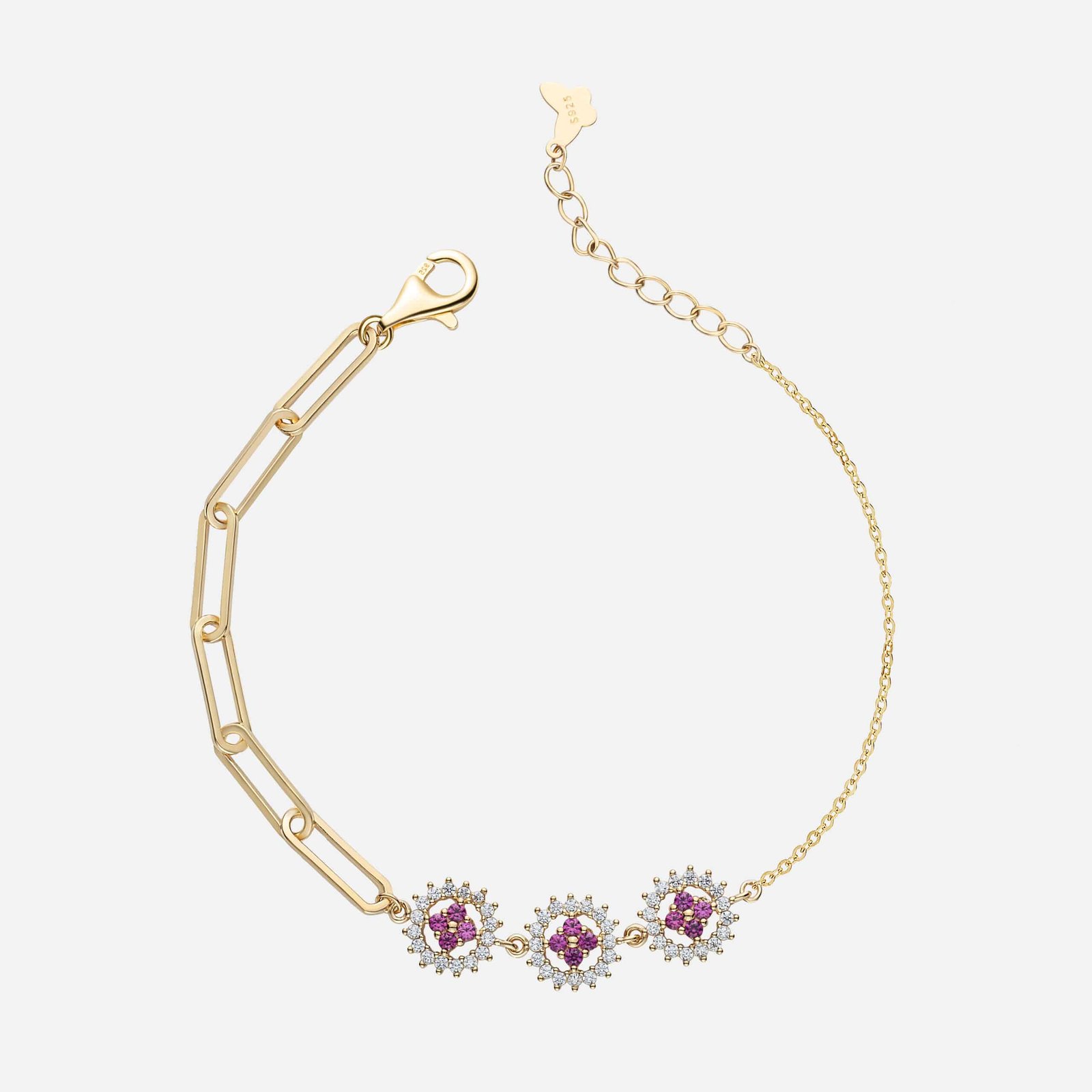 Bold meets elegant in the Magenta Mist bracelet, crafted from a paperclip-style chain that adds modern edge to a refined design. At the centre, three circular motifs sparkle with halos of clear stones, each encircling four radiant magenta gems arranged in a graceful quatrefoil pattern. A striking fusion of structure and sophistication, it’s a statement piece that carries both strength and femininity.