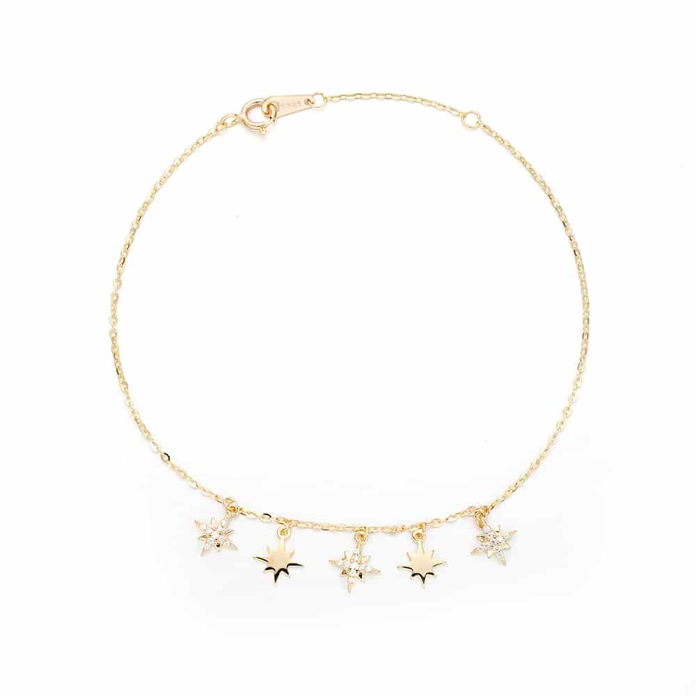 Delicate yet dazzling, the Nova Bracelet is a tribute to the brilliance of the night sky. Suspended from a fine gold chain, alternating star charms — some polished, others pavé-set with shimmering stones — twinkle like constellations in motion. Light, elegant, and endlessly enchanting, this bracelet is your everyday spark of cosmic wonder — a reminder that even the smallest stars shine bright.