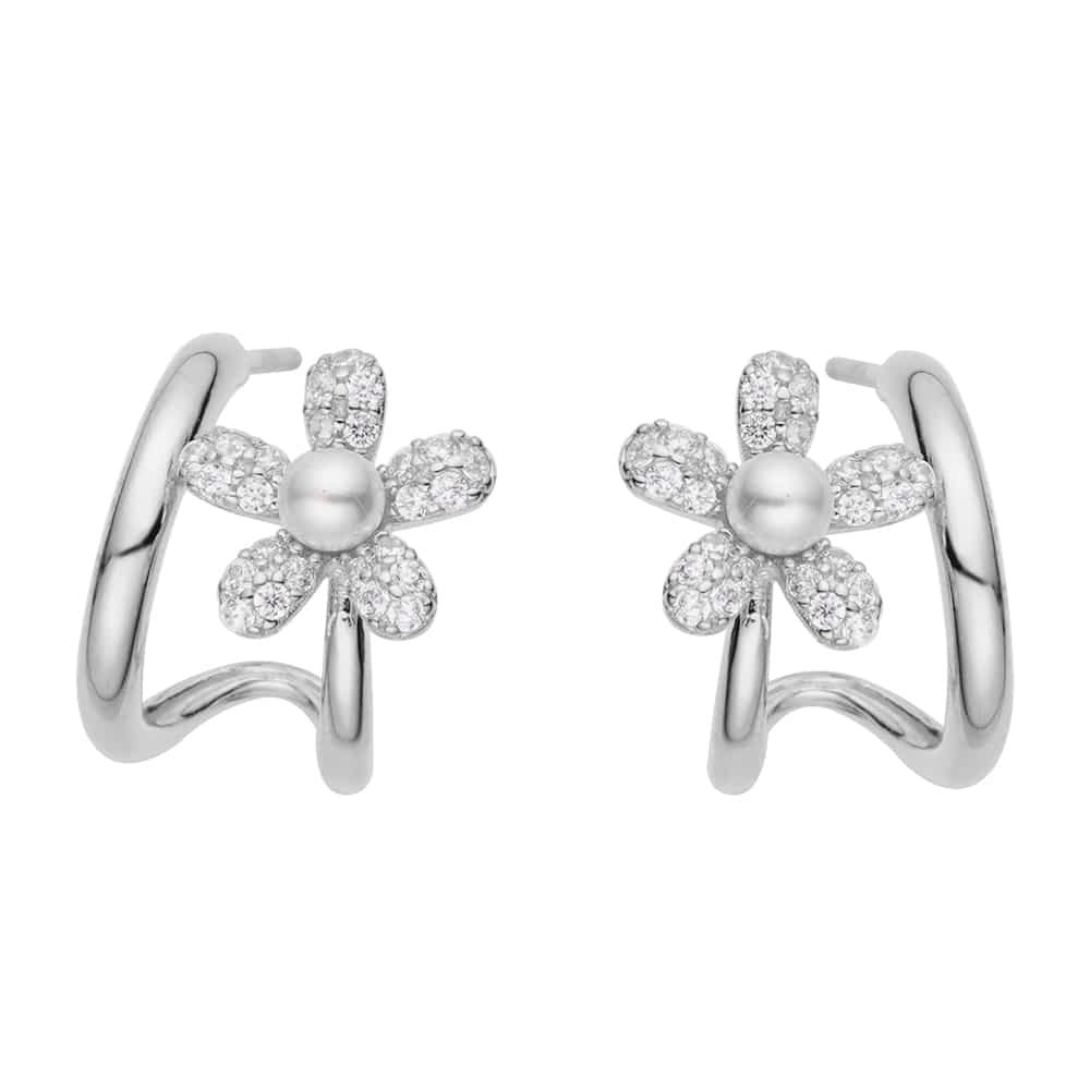 A graceful blend of structure and softness, Petal Curve is a curved ear cuff-style earring adorned with a delicate floral design. Each flower sparkles with clear stones and cradles a single pearl at its heart, adding a touch of natural charm to a contemporary silhouette. Available in both silver and gold, it’s the perfect balance of modern elegance and romantic detail.