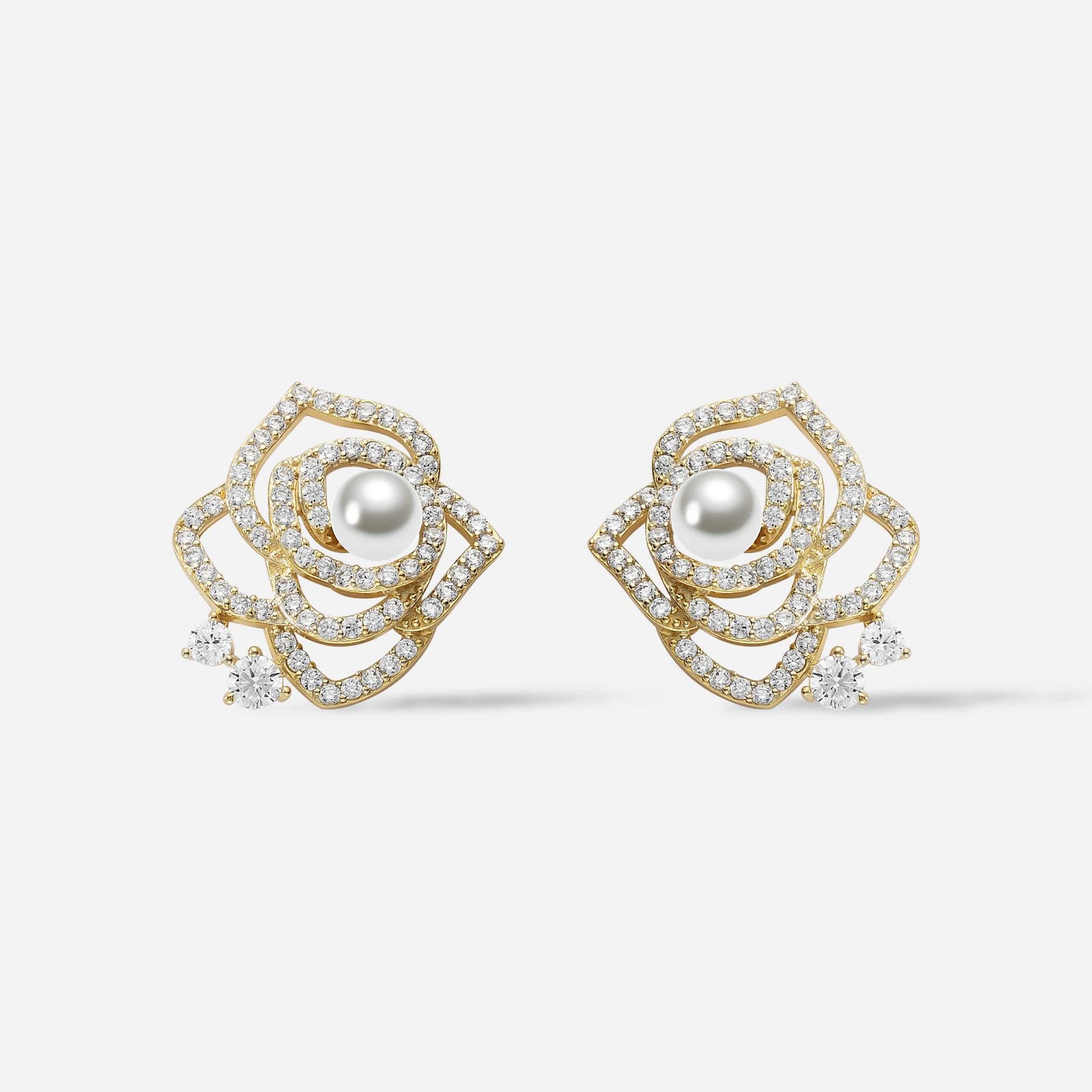 Exquisitely crafted, Reina is a pair of gold earrings designed as blooming roses, with delicate petals traced in pav-set diamonds and a luminous pearl nestled at each centre. Beneath the floral motif, small diamond clusters dangle gently, adding graceful movement and subtle brilliance. Elegant and intricately detailed, Reina is a timeless expression of royalty and refined beauty.