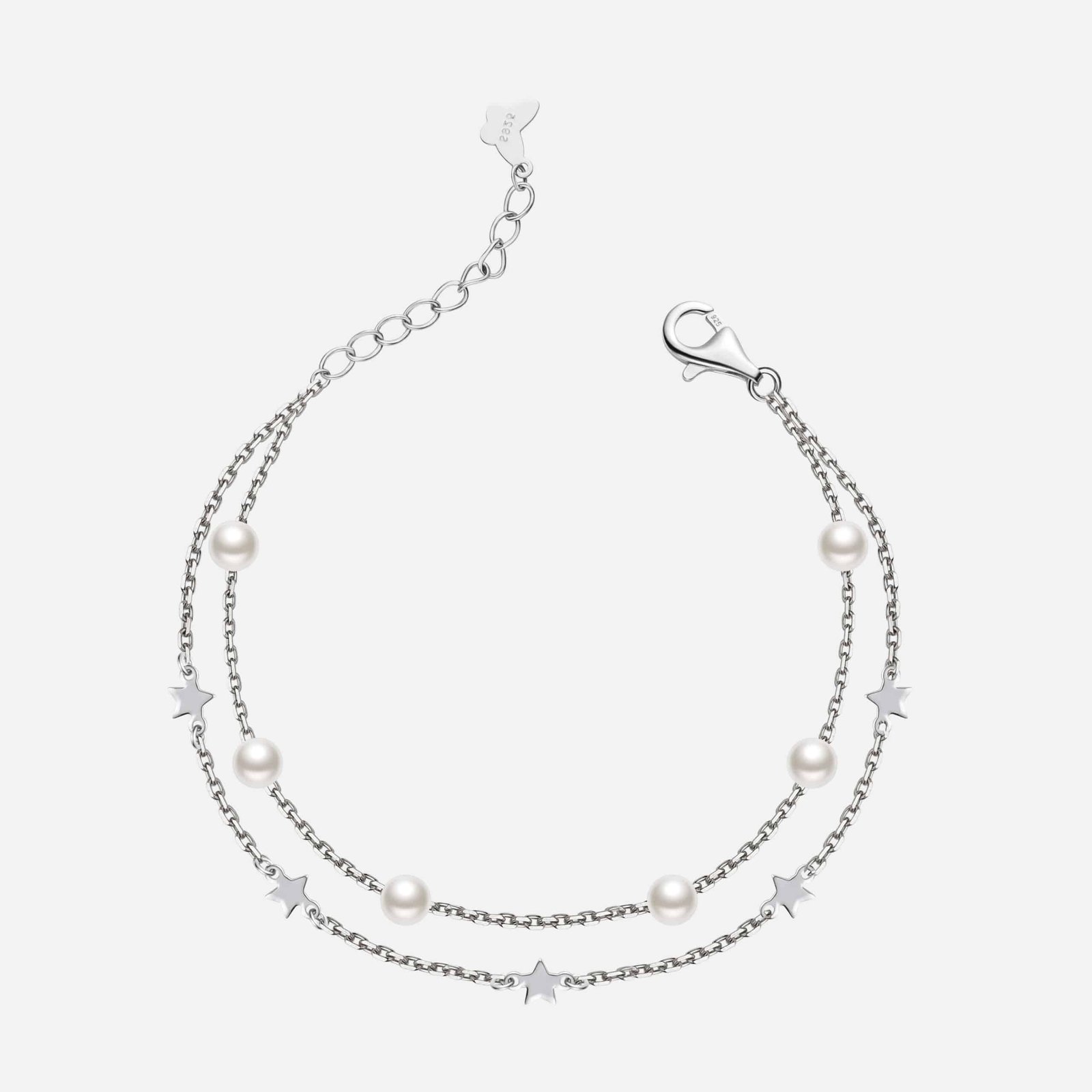 Silver Sky is a delicate double-stranded bracelet crafted in sterling silver. Soft white pearls are interspersed along the chains, paired with small, flat star charms that add a subtle celestial sparkle. Minimalist and elegant, Silver Sky is a dreamy blend of cosmic beauty and timeless style – perfect for everyday layering or gifting something with a little stardust.